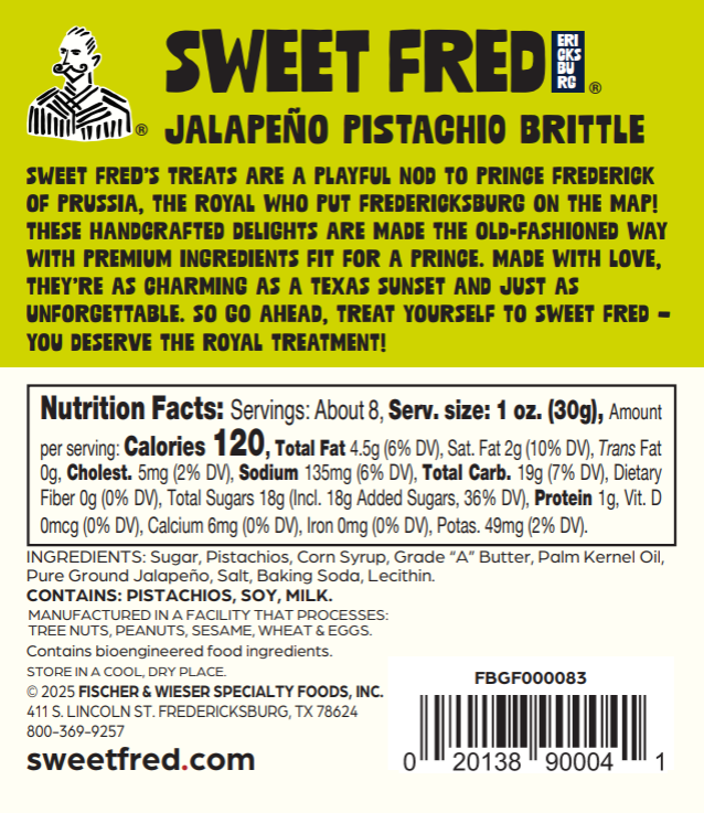 Give your taste buds a royal surprise—shop Sweet Fred Jalapeño Pistachio Brittle today!