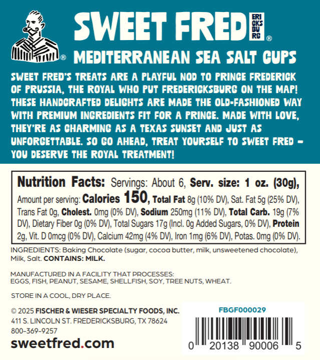 Sweet Fred Mediterranean Sea Salt Cups blend silky milk chocolate with the bright, clean flavor of Mediterranean sea salt. The result is a refined treat that delivers both sweetness and a savory edge—simple, elegant, and irresistible.