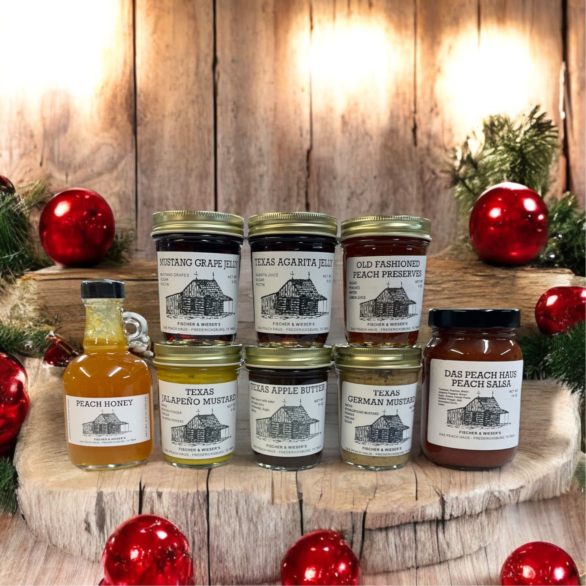 • What products are included in this set? – Das Peach Haus Peach Salsa, Peach Honey, Texas Apple Butter, Texas Agarita Jelly, Texas German Mustard, Texas Jalapeño Mustard, Old-Fashioned Peach Preserves, and Mustang Grape Jelly.