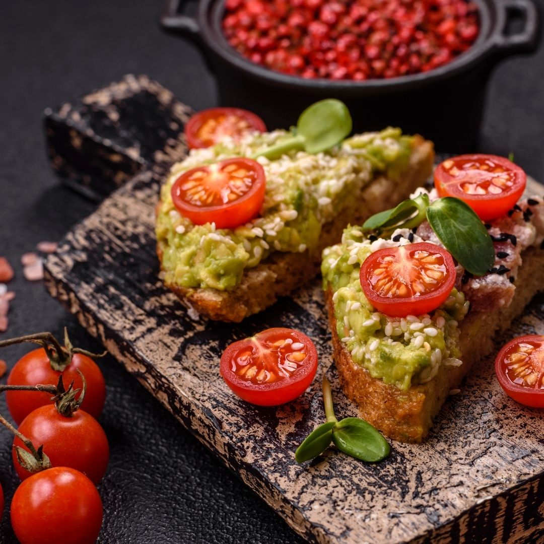 • Avacodo Toast with Marinated Tomatoes and Smoked Salmon